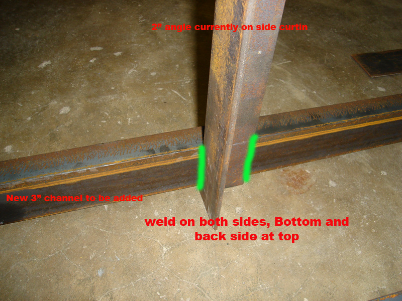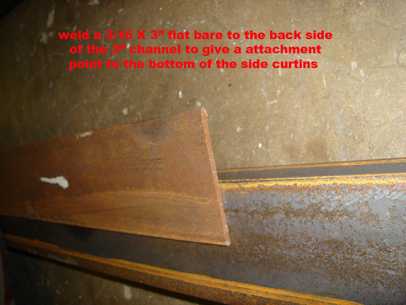 On the back side you will need to weld a 3/16" X 3" flat bar steel to have an attachment point for the bottoms of the side curtains panels. the will be needed between each of the 2" angles. You can most likely get away with a 2" weld every twelve inches